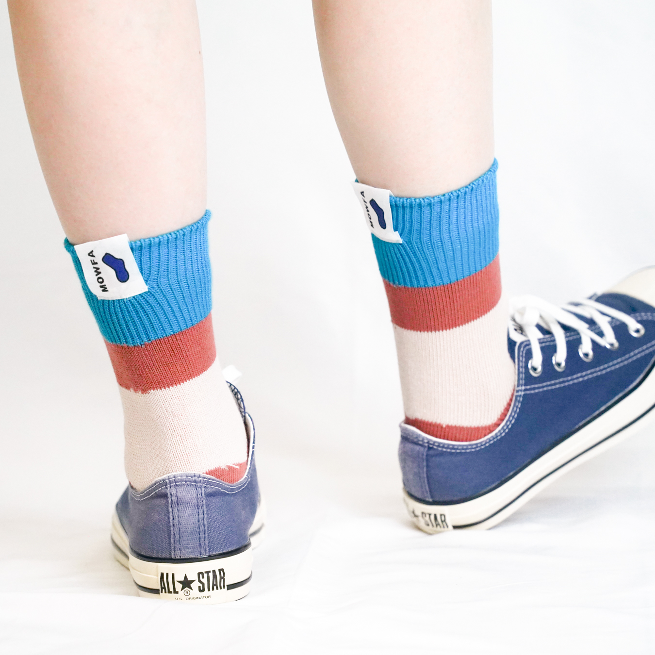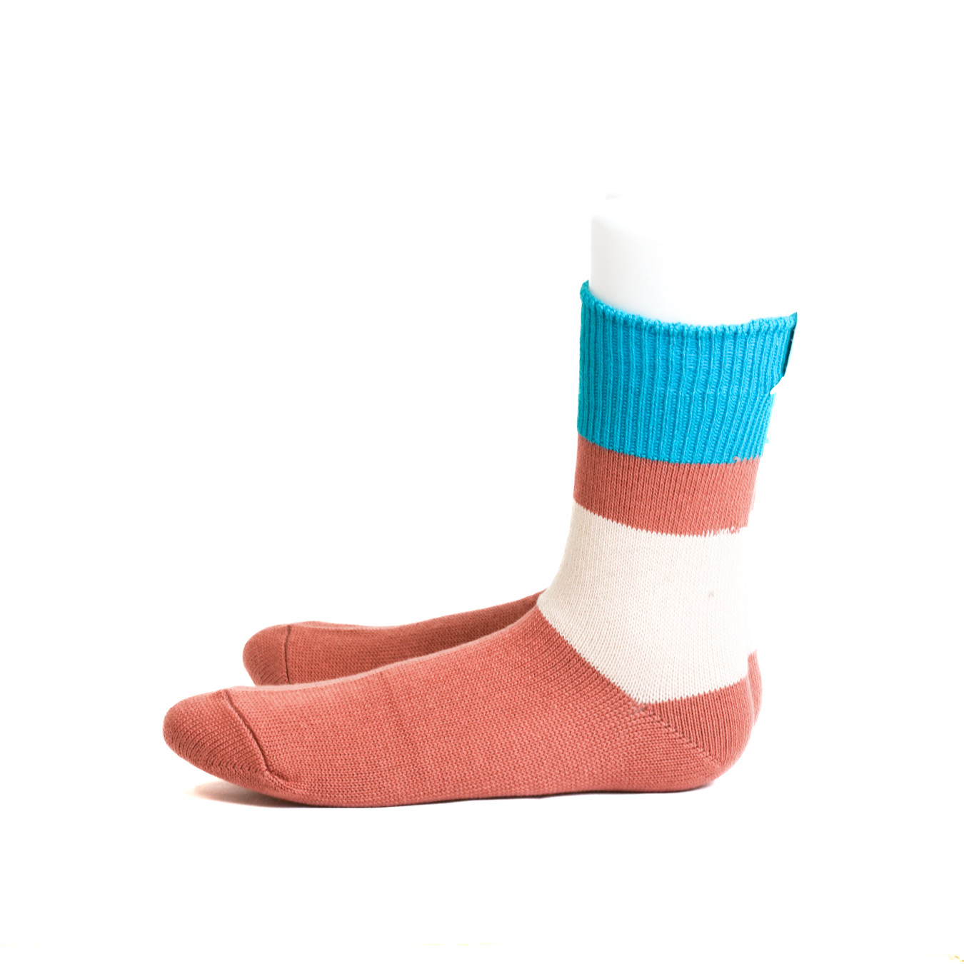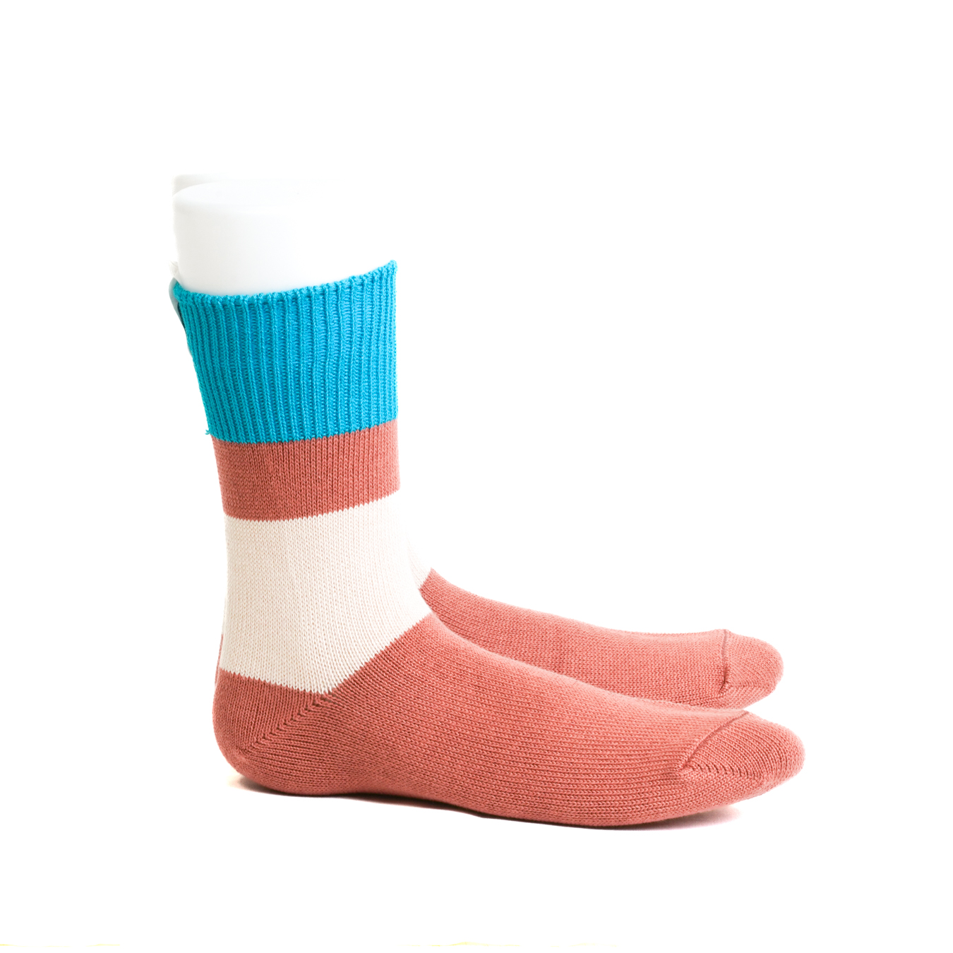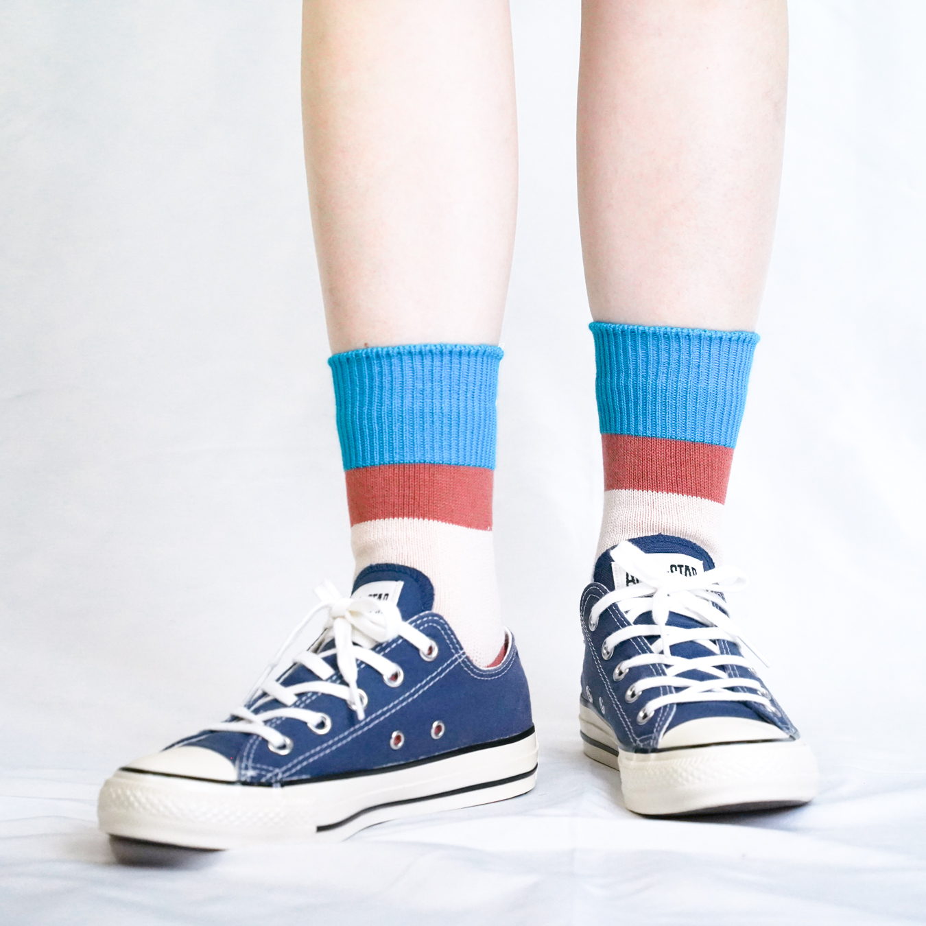 太めの糸で編み上げた、さっぱり爽やかに履ける3色づかいが特徴のトリコロールソックス。