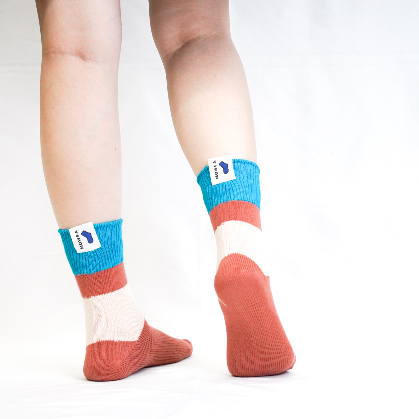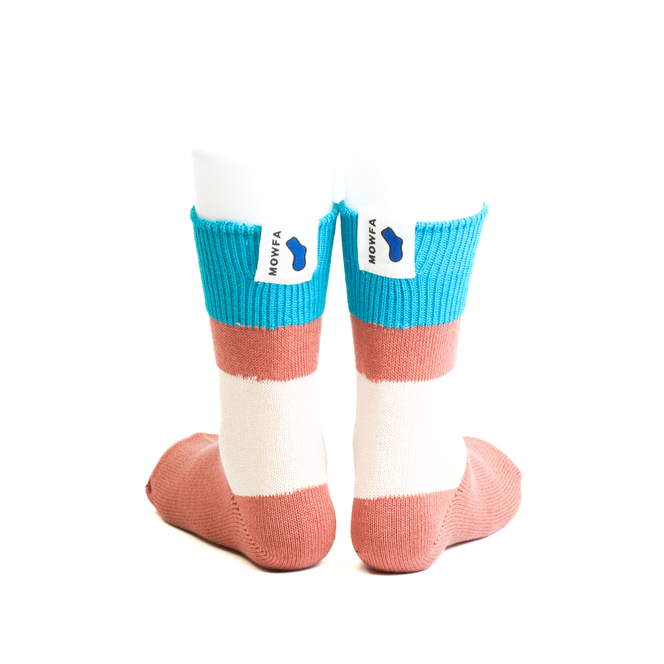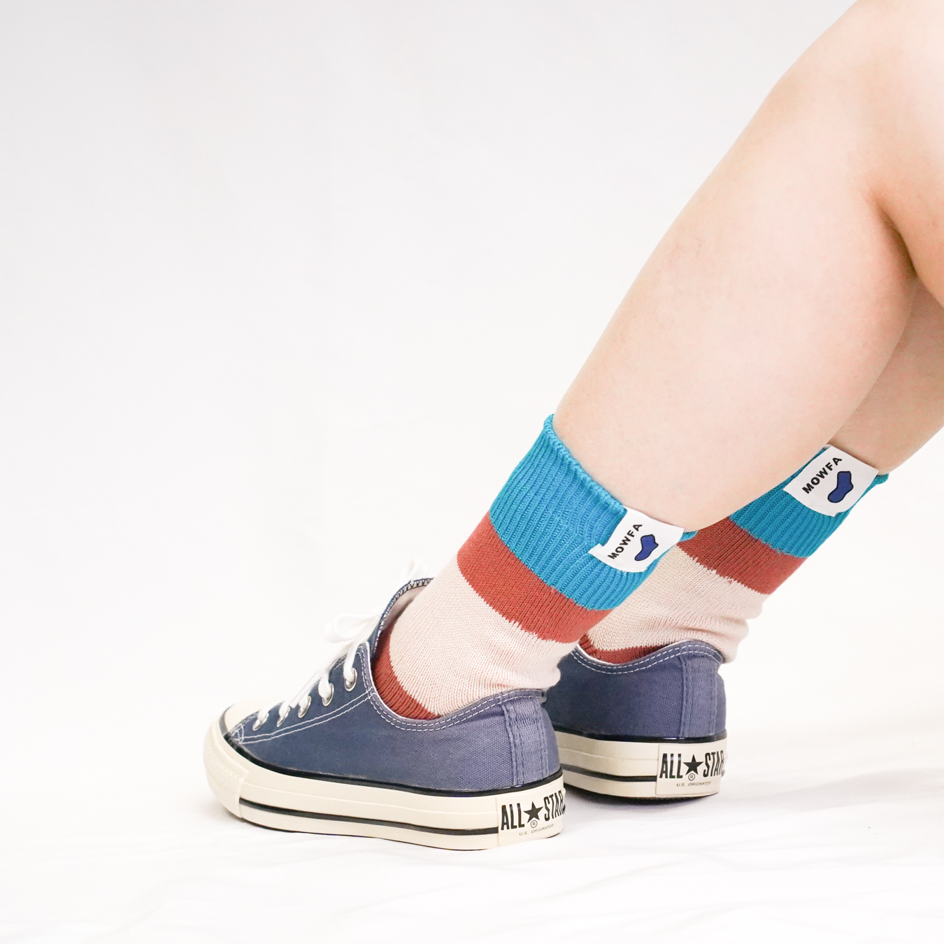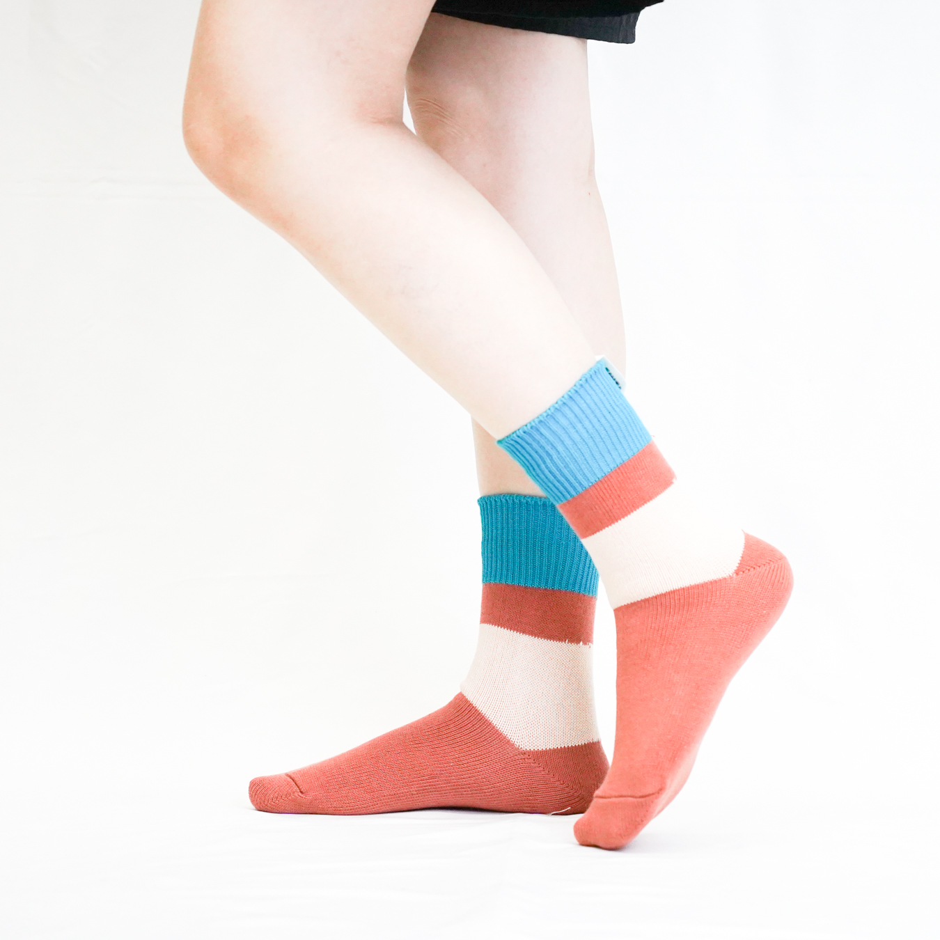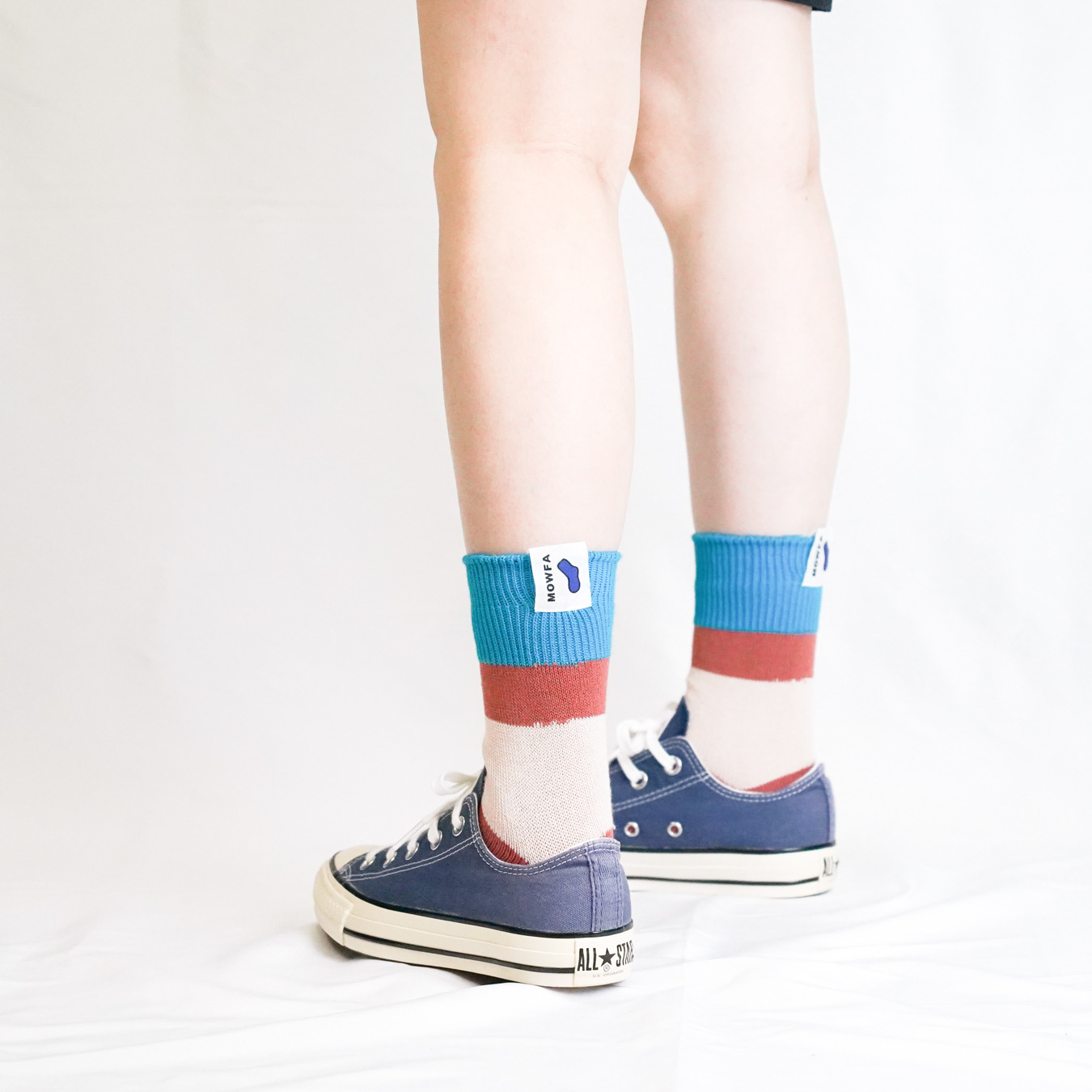 太めの糸で編み上げた、さっぱり爽やかに履ける3色づかいが特徴のトリコロールソックス。