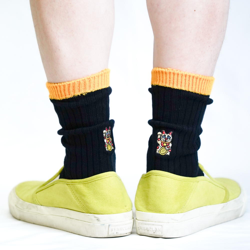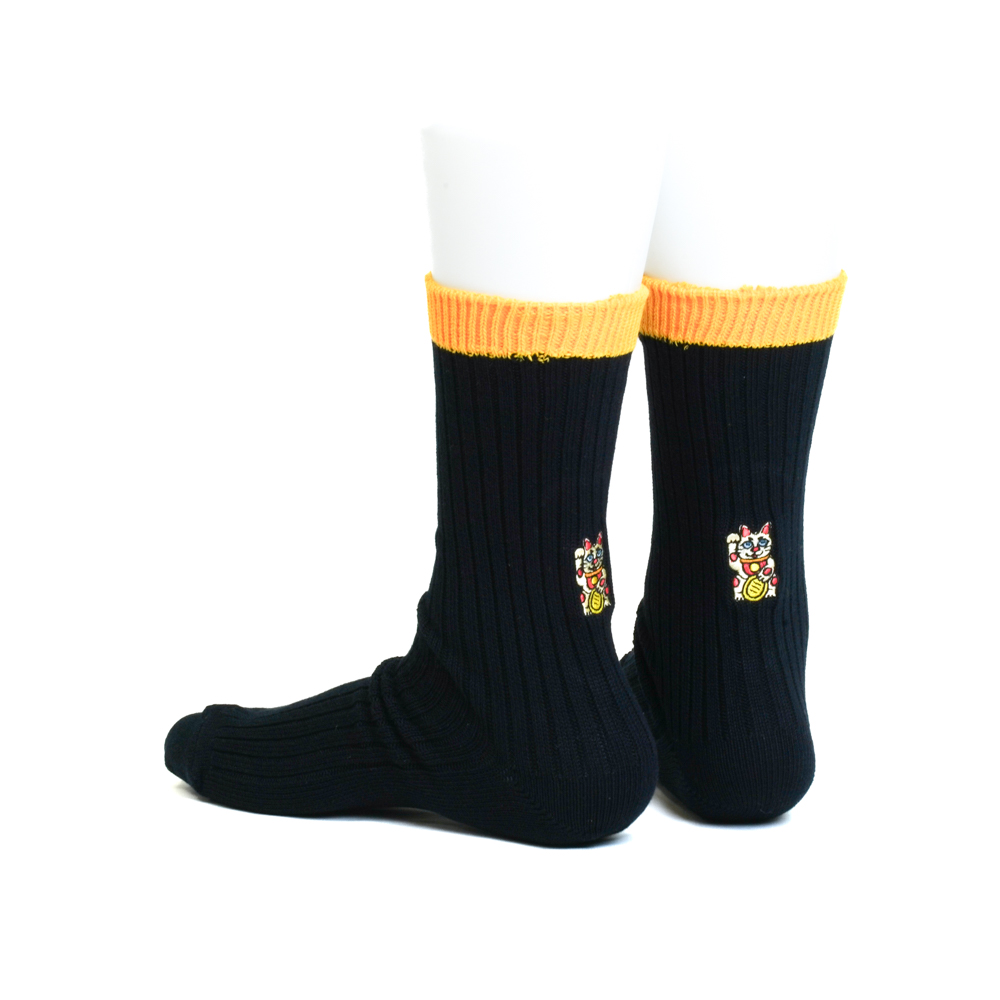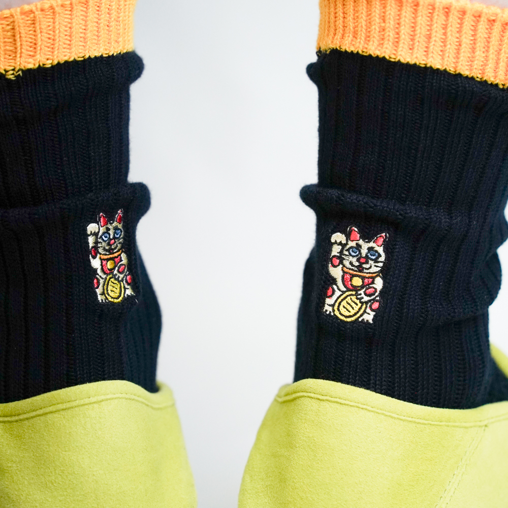 招き猫刺繍ソックス ブラック/イエロー【Men】