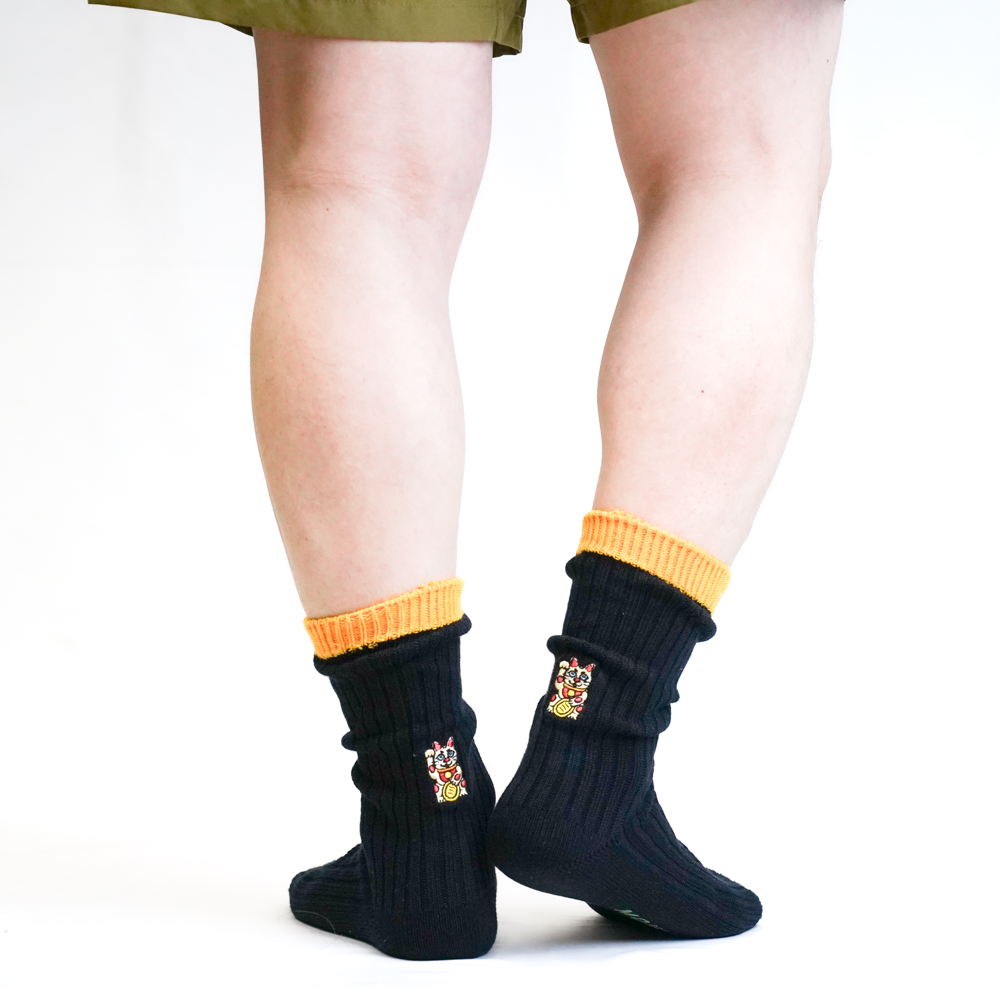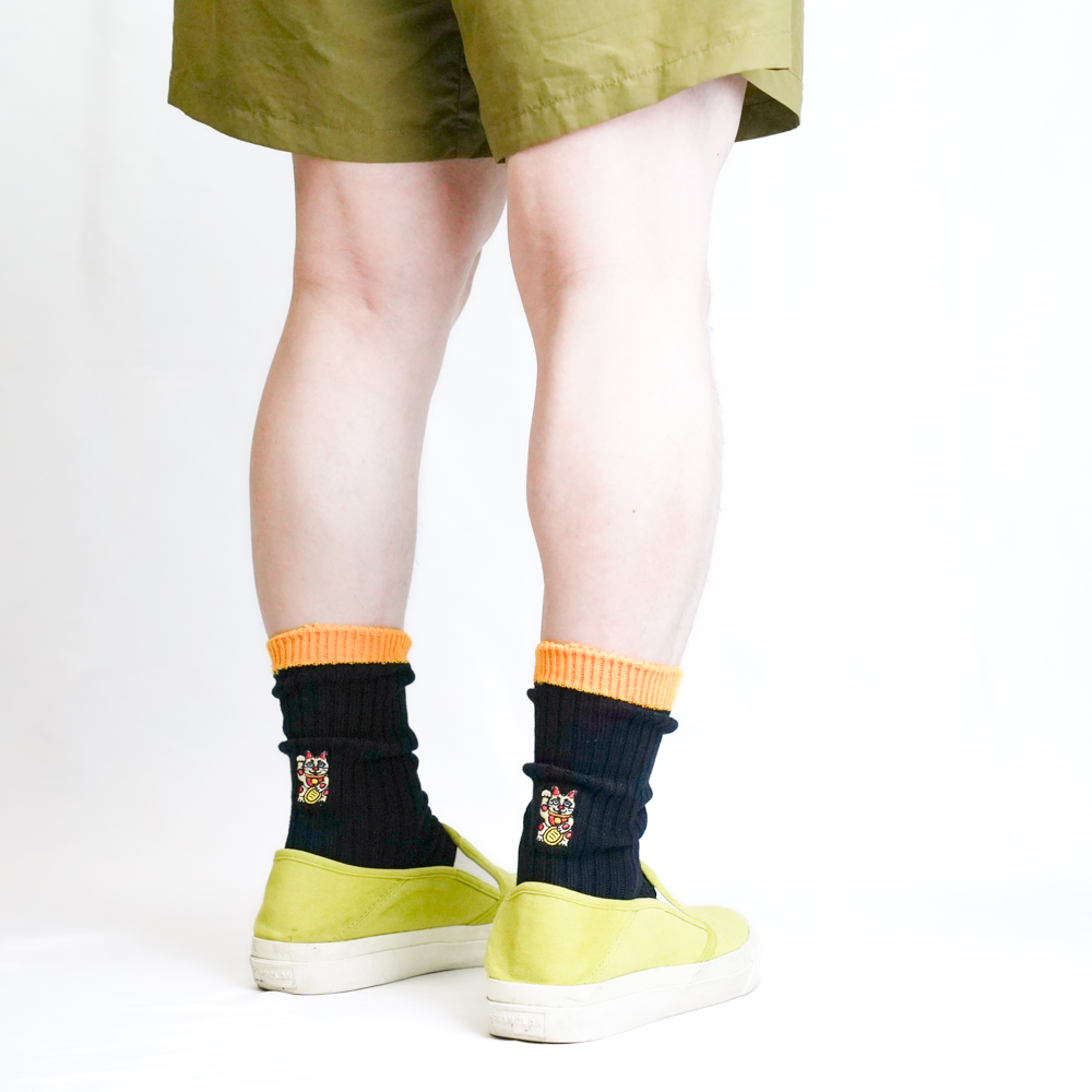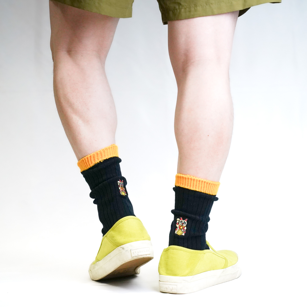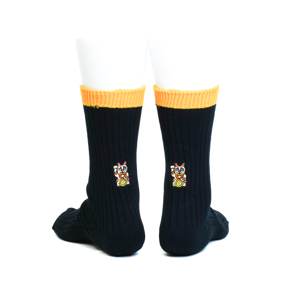 招き猫刺繍ソックス ブラック/イエロー【Men】