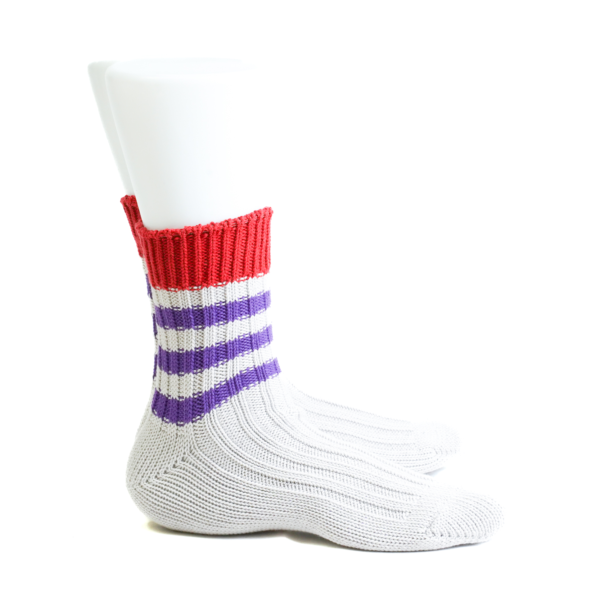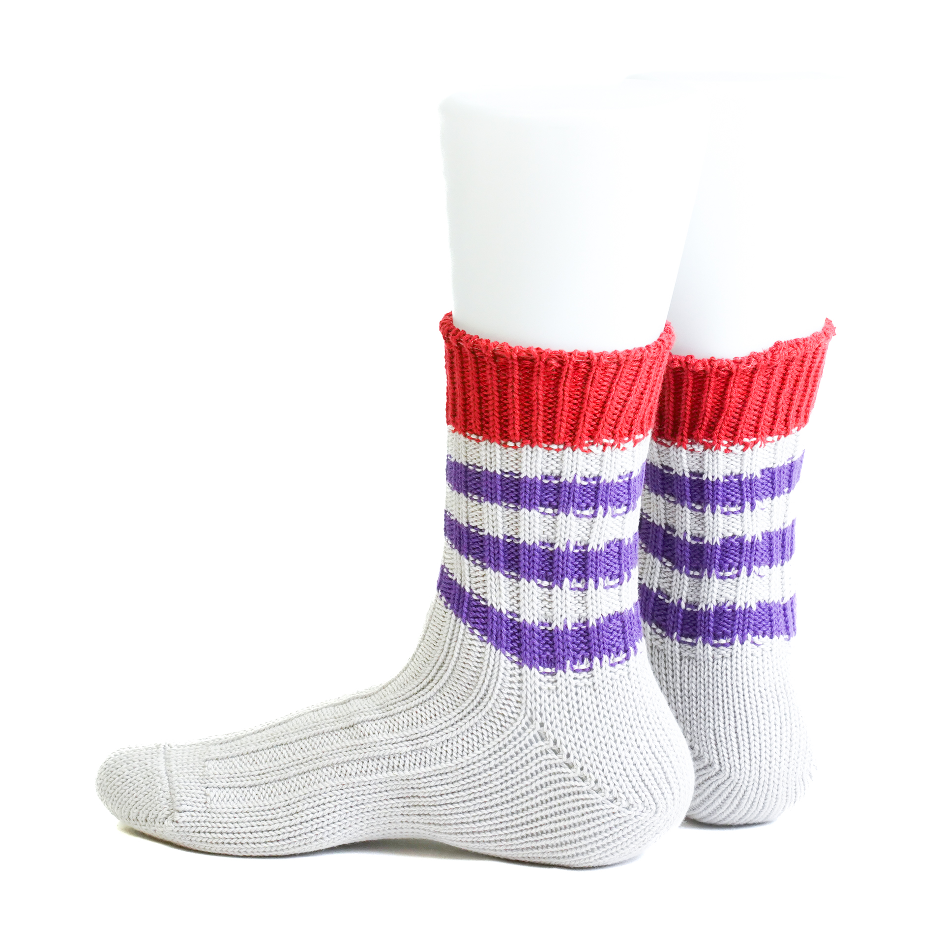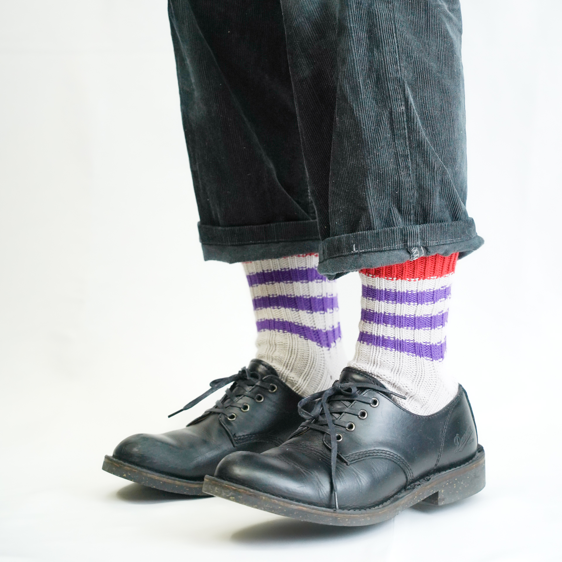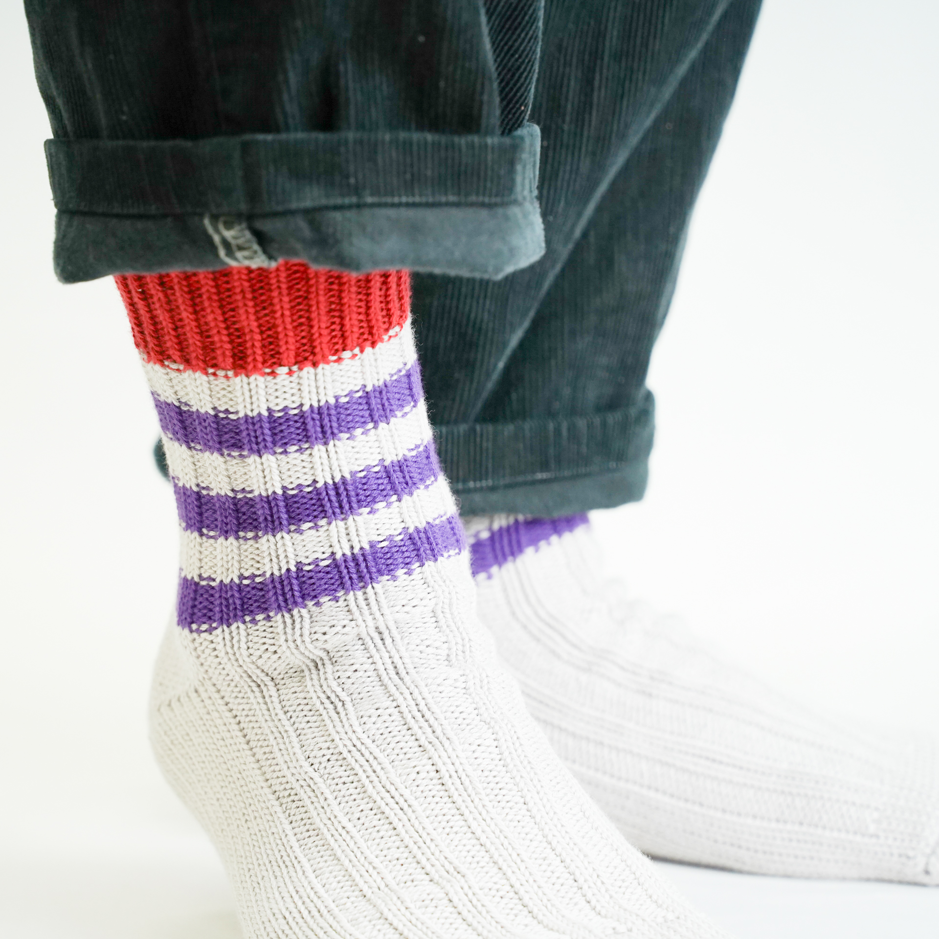 日本に数台しか存在しない希少性の高い旧式の機械で編まれた、どこか懐かしさを感じるクラシックな配色が印象的な、合わせやすいラインソックス。