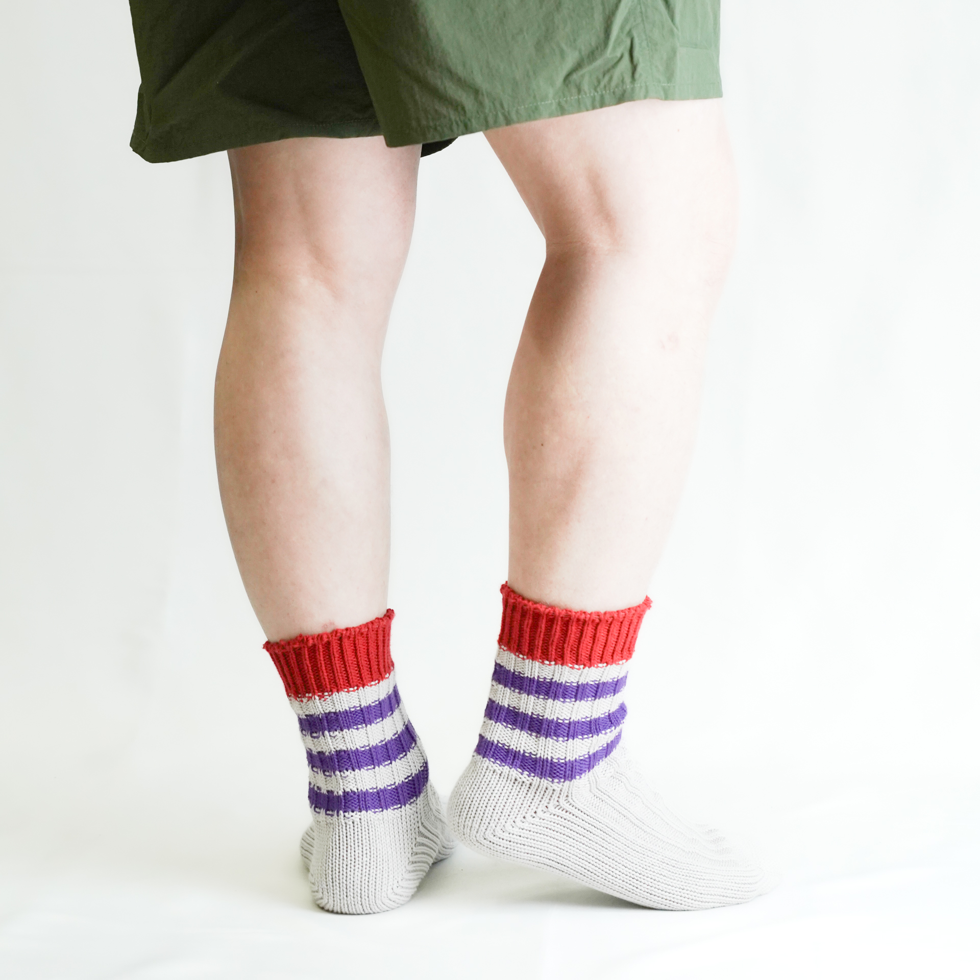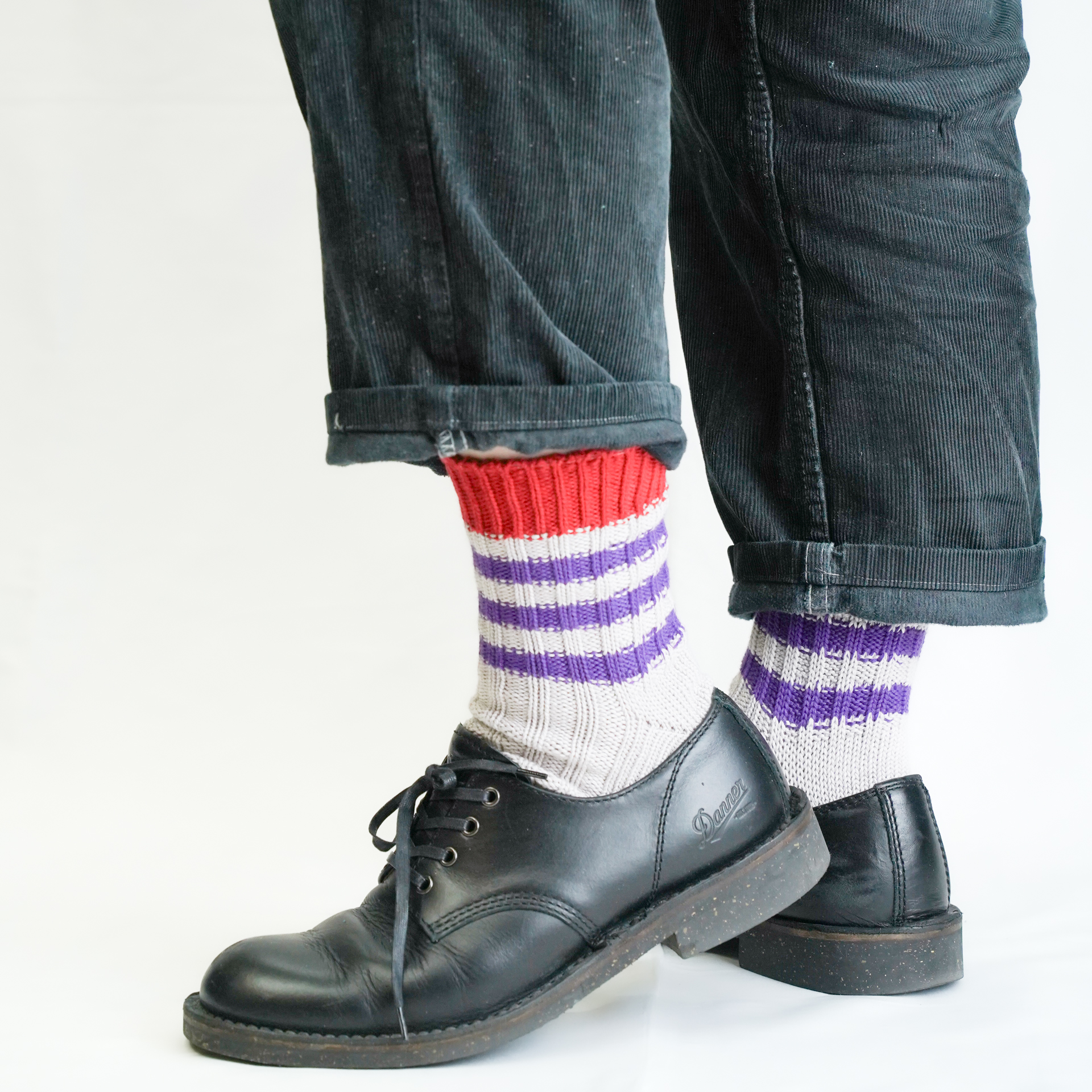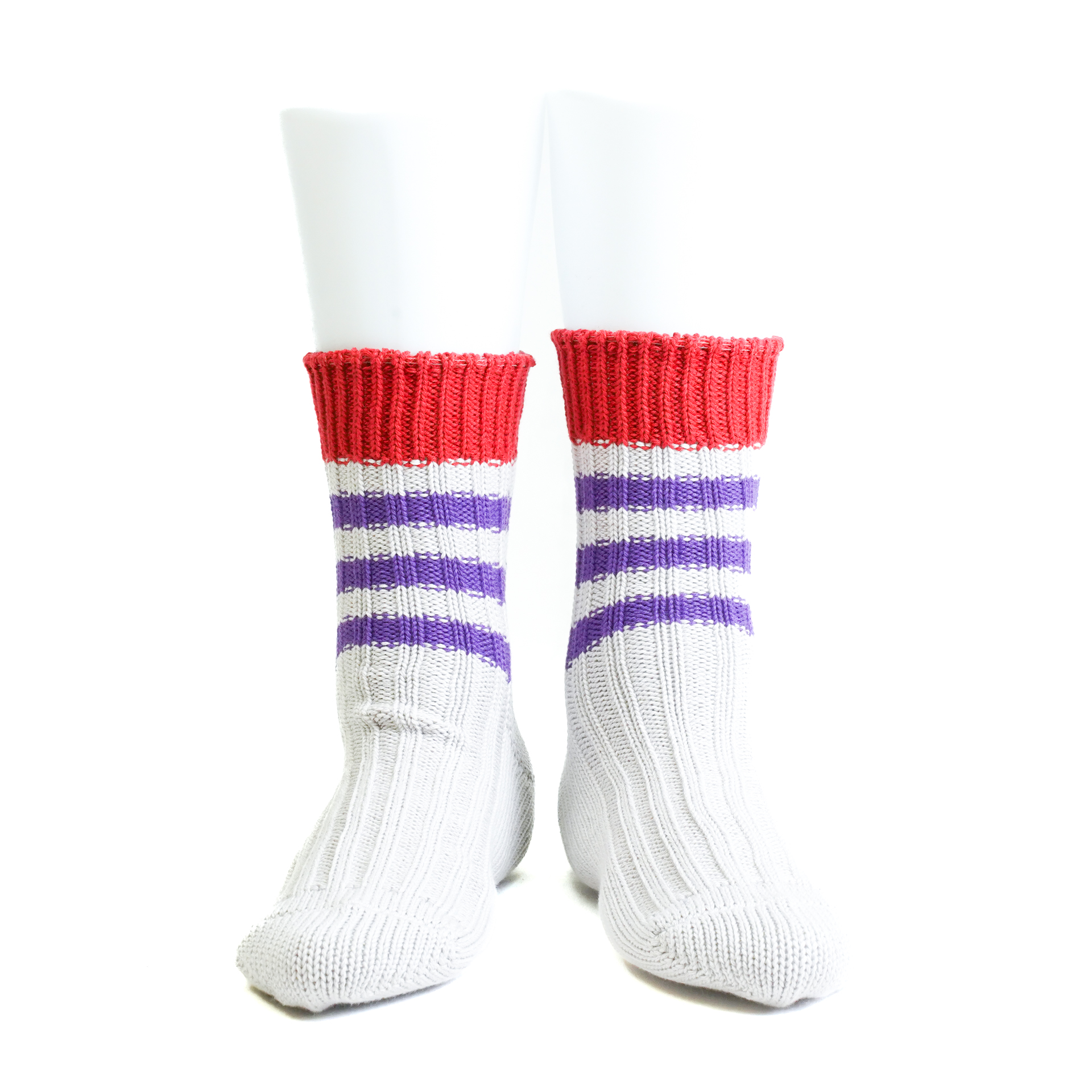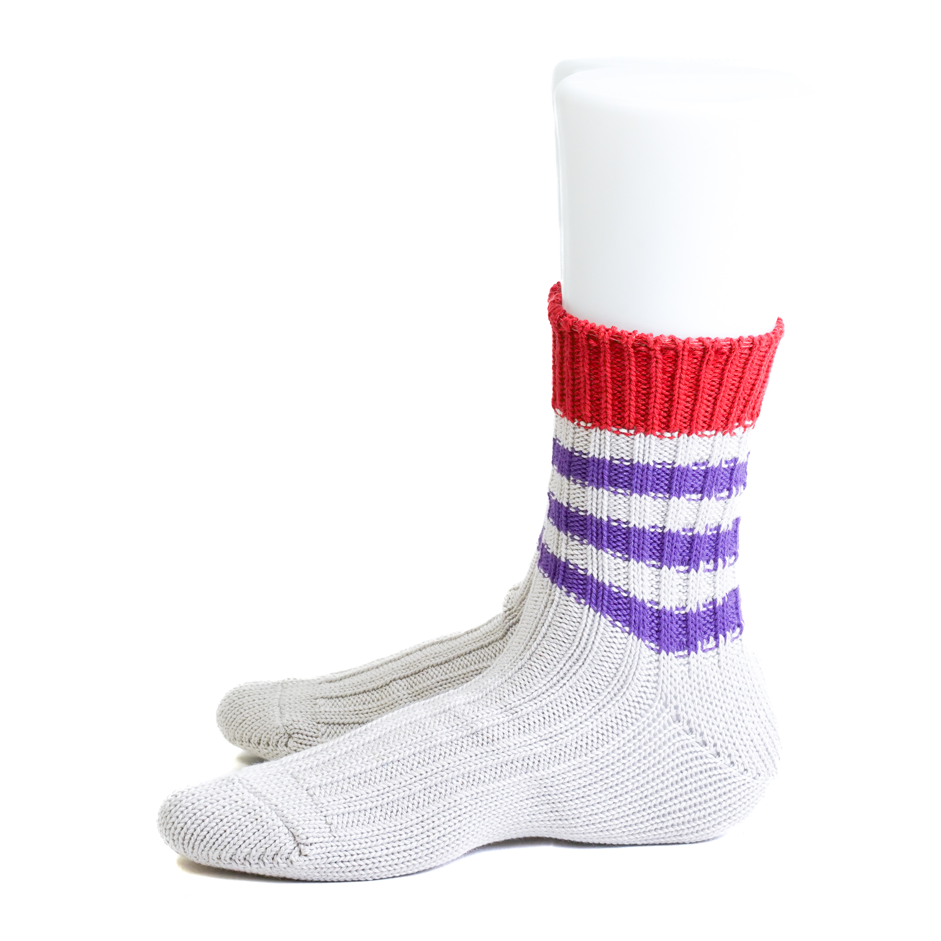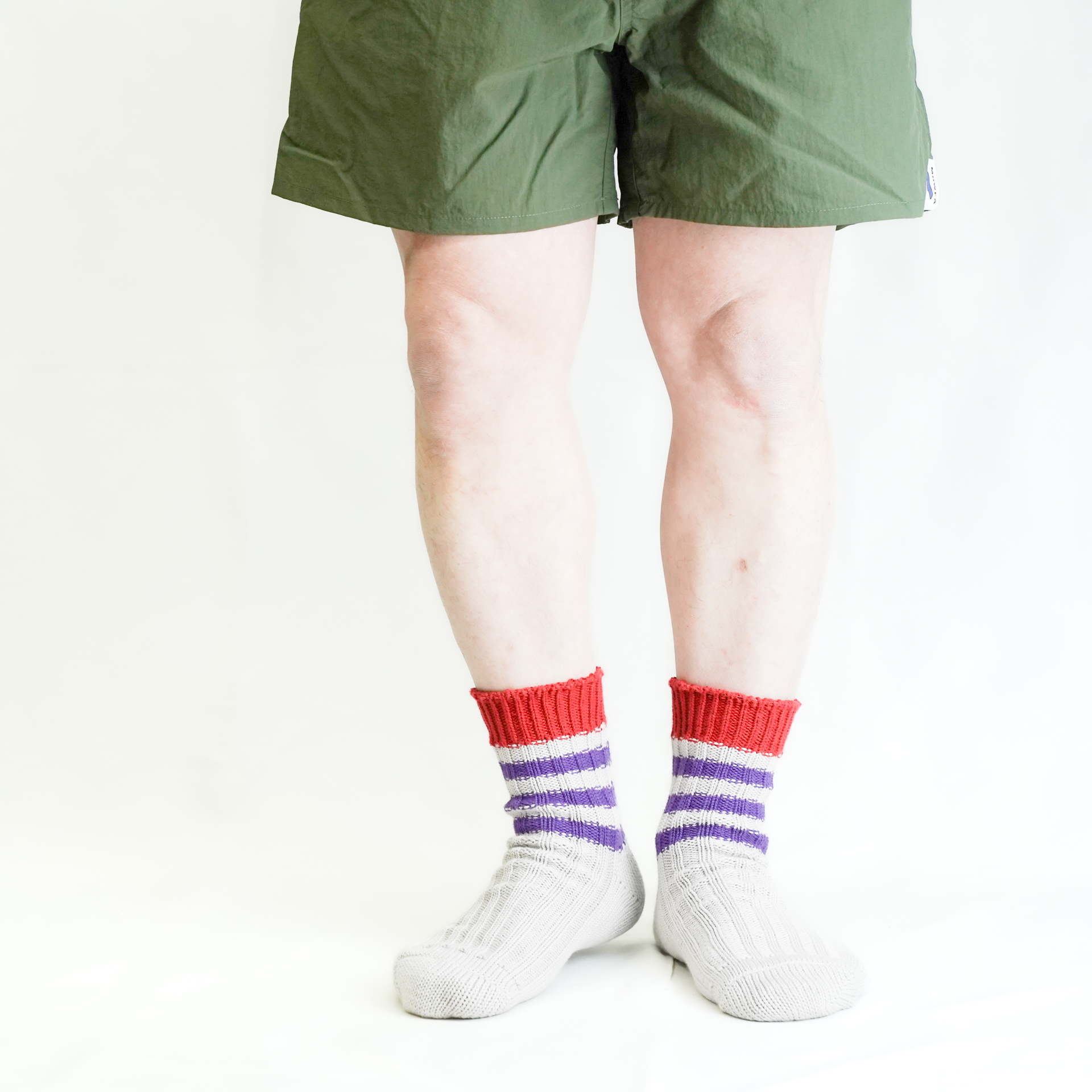 日本に数台しか存在しない希少性の高い旧式の機械で編まれた、どこか懐かしさを感じるクラシックな配色が印象的な、合わせやすいラインソックス。