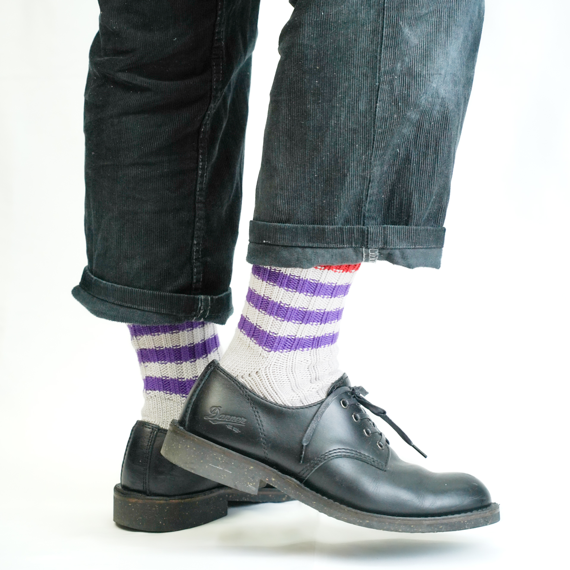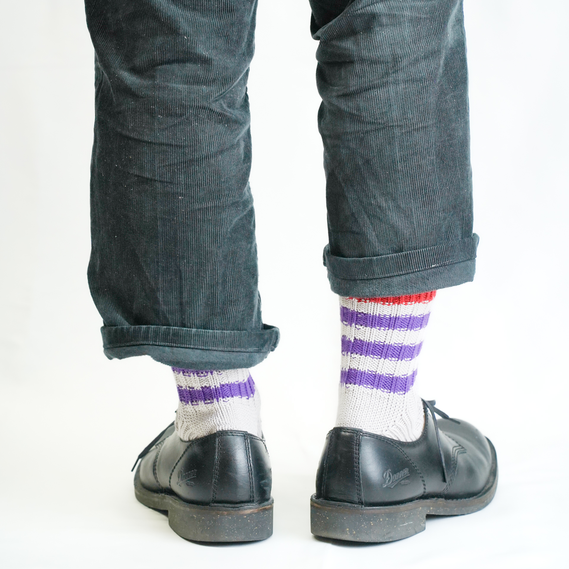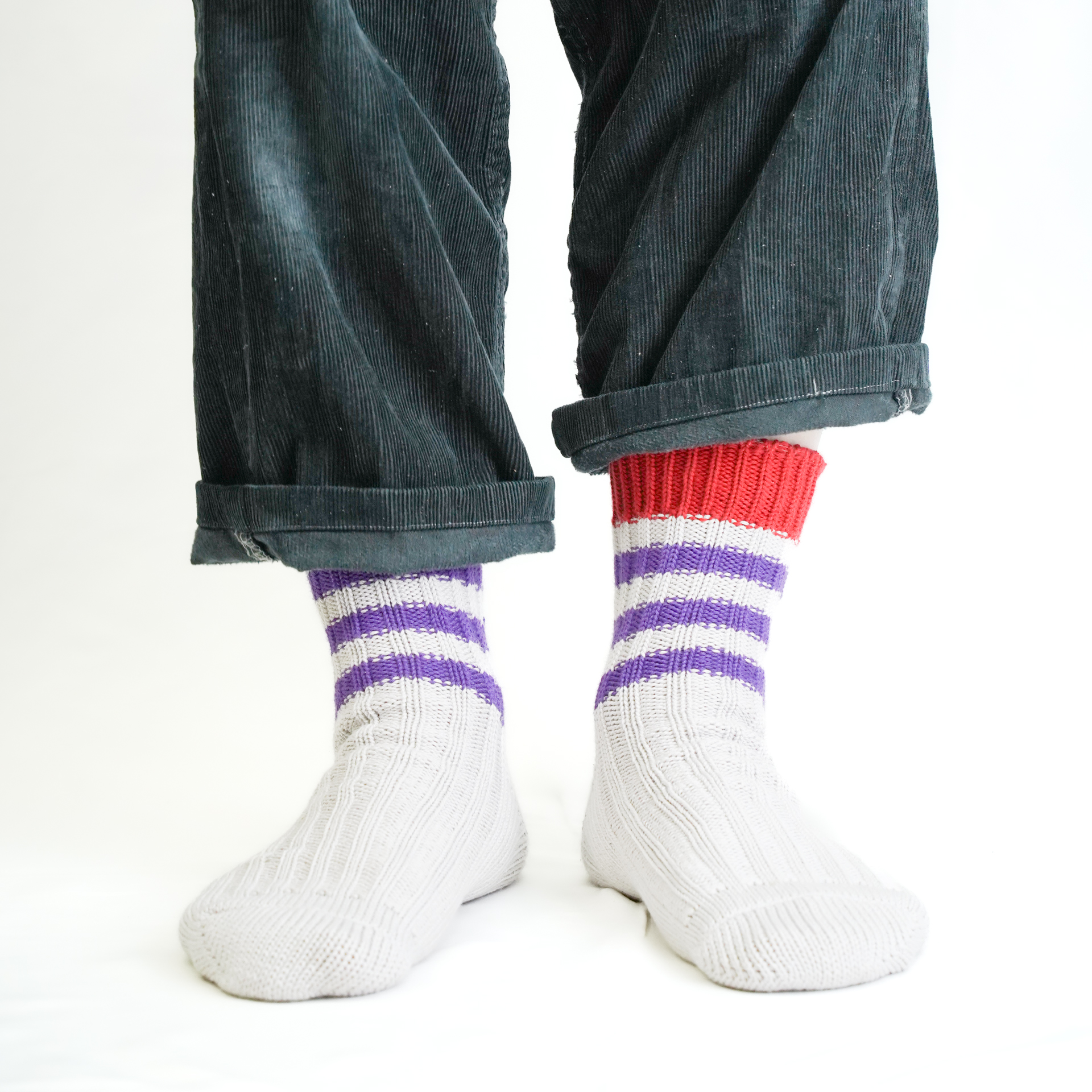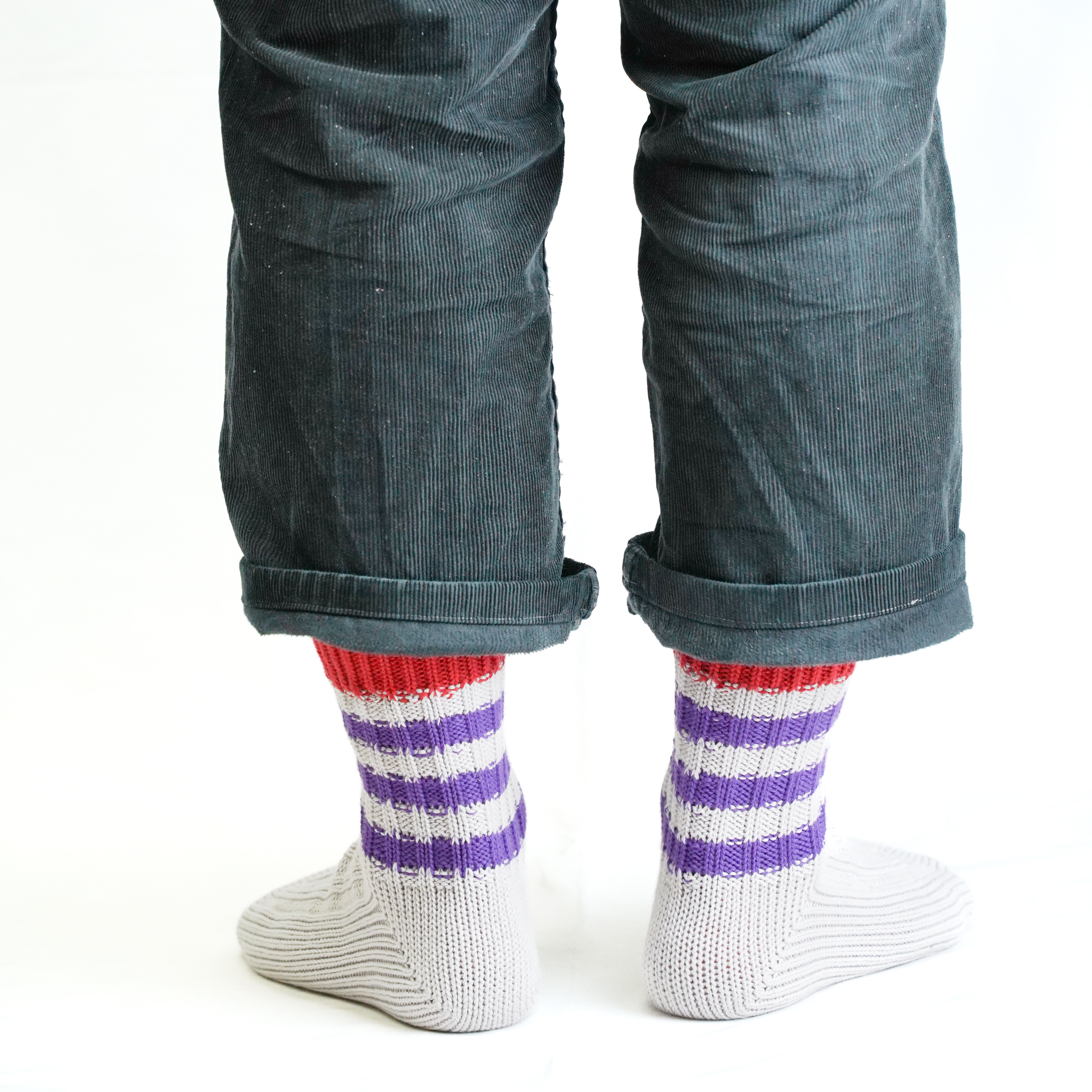 日本に数台しか存在しない希少性の高い旧式の機械で編まれた、どこか懐かしさを感じるクラシックな配色が印象的な、合わせやすいラインソックス。