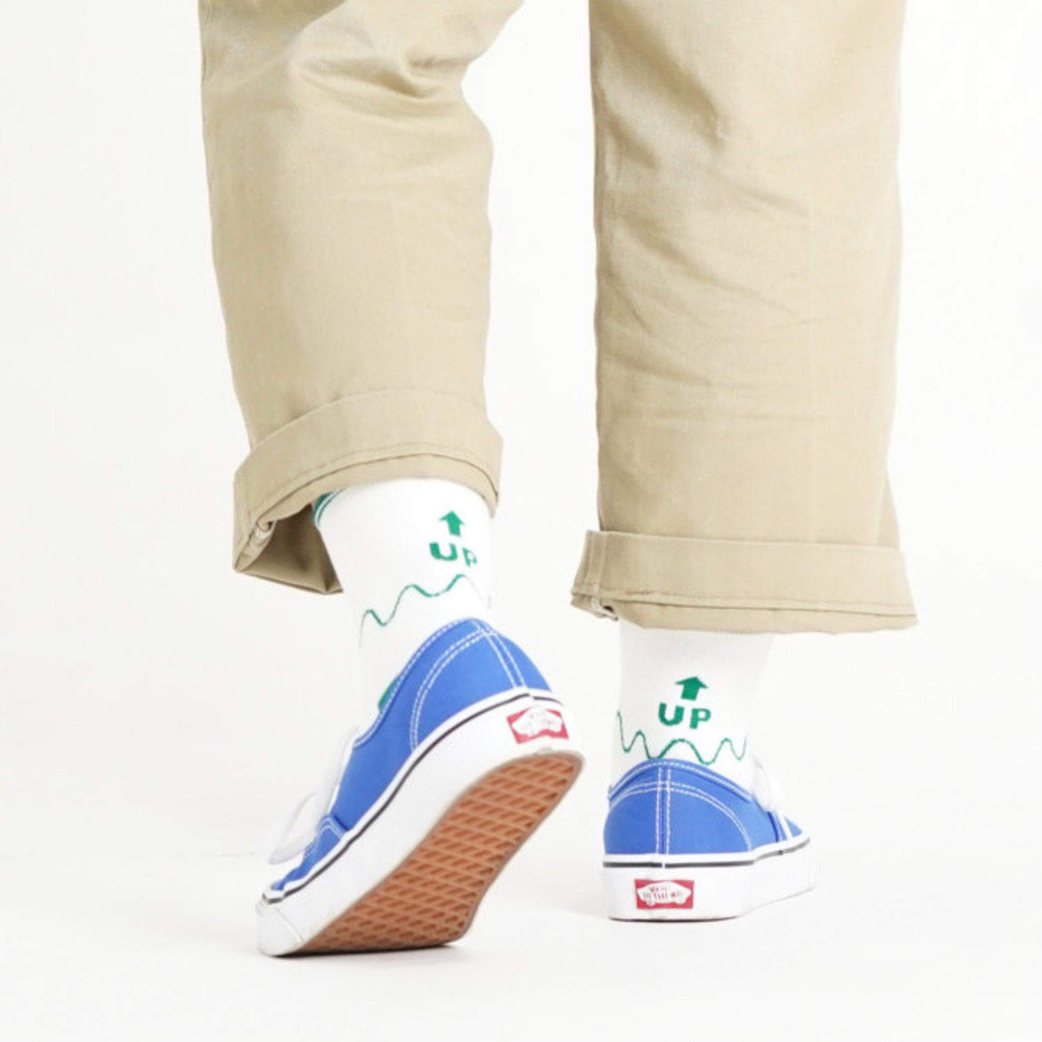 スニーカーを履いた時に波線部分がパンツと靴の間からちらっと顔を出すデザインになっています。靴下背面のUPアイコンは『今日も気分が上がりますように』をテーマとし、履いた人が明るく楽しい1日になるようにデザインしました。贈り物の靴下として喜んでもらえるような意味を込めています