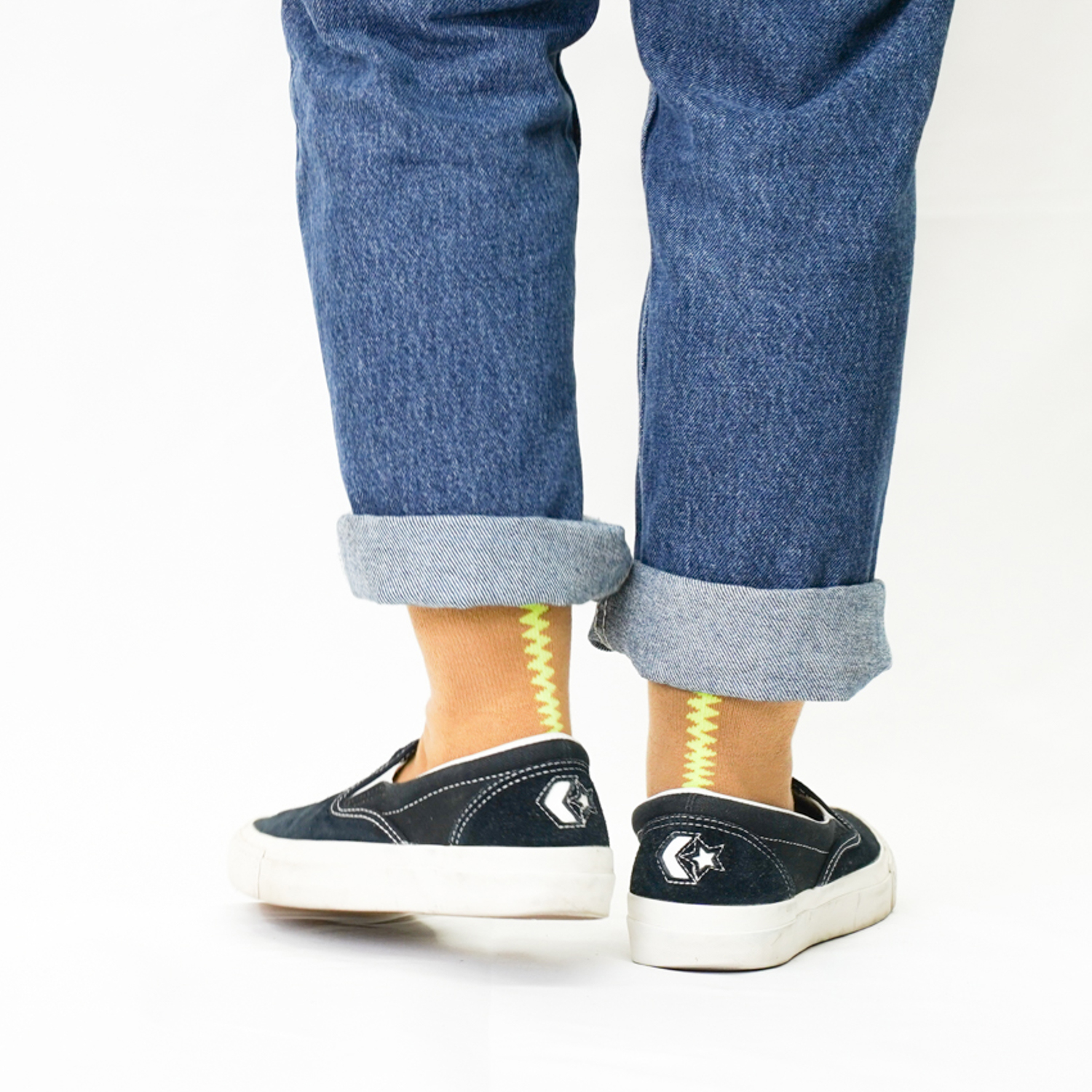畳んだ時には縁にギザギザが入り、履いた時には真ん中にギザギザがある、見ても履いても楽しいデザインです。